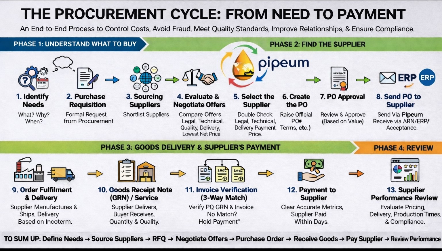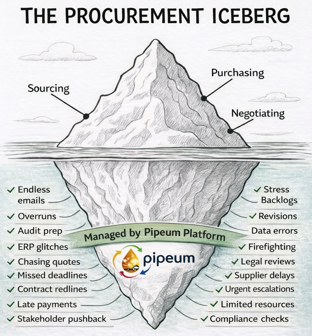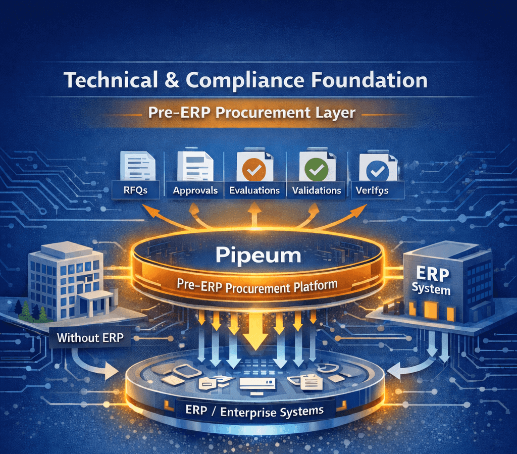 Pipeum operates as a Pre-ERP procurement layer, structuring and governing procurement activities before data enters an ERP system. This ensures that only approved, validated, and audit-ready information flows downstream—improving data quality, reducing errors, and strengthening compliance.